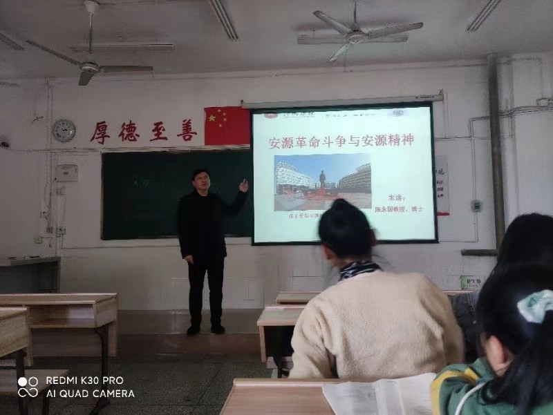 陈永国以“安源革命斗争与安源精神”为题,围绕安源革命斗争状况、安源精神内涵,向学生讲述了安源工人从早期斗争到全面兴盛的革命历程;讲述了安源工人义无反顾、不惧牺牲的大无畏精神;团结奋斗、同心同德的拼搏精神;依靠群众勇于开拓的革命精神;敢为人先、脚踏实地的创新精神。