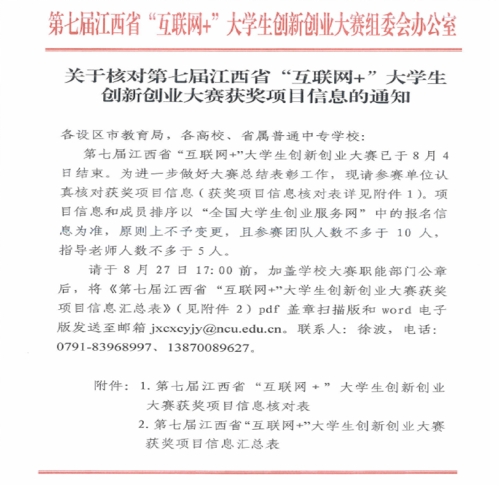 近日,江西省教育厅公布了“建行杯”江西省第七届“互联网+”大学生创新创业大赛获奖名单,我校取得3银1铜的好成绩。