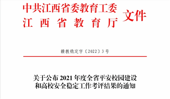 同时,在江西省委教育工委、省教育厅印发的《关于公布2021年度全省平安校园建设和高校安全稳定工作考评结果的通知》(赣教稳定字(2022)3号)中,我校在平安校园建设中因工作扎实、措施到位、全年未发生安全稳定事故、综合考评获全省高校本科组(共33所)第九名,受到省教育厅通报表扬。