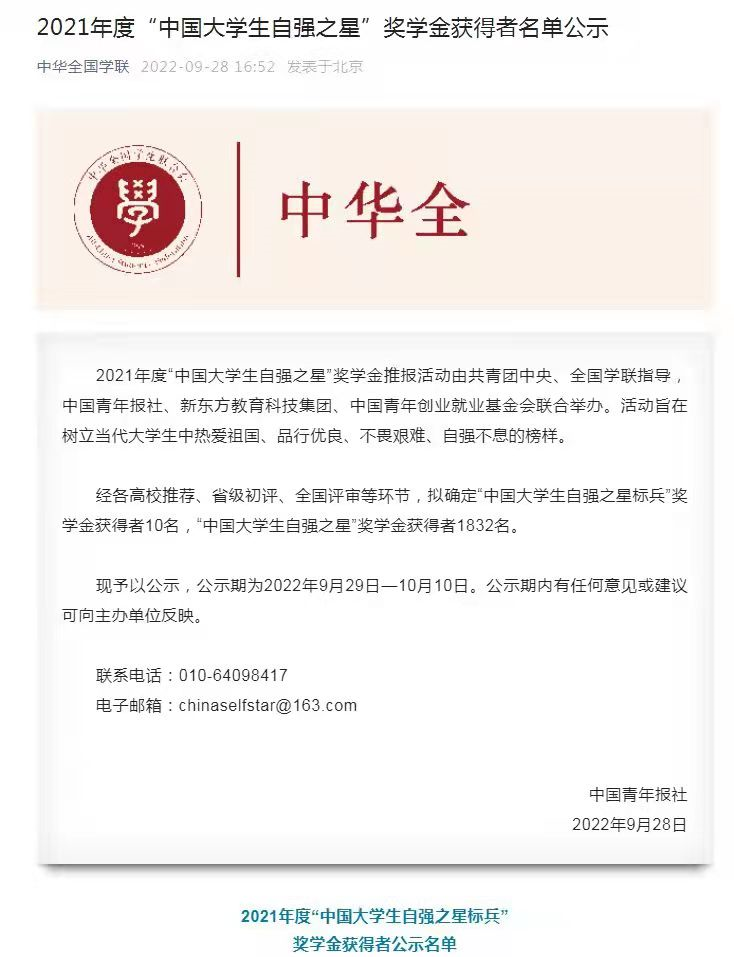 近日,由共青团中央、全国学联指导,中国青年报社、新东方教育科技集团、中国青年创业就业基金会联合举办的2021年度“中国大学生自强之星”奖学金评选活动结果揭晓。经学生自主报名、学校审核推荐、省级初评、全国评审等环节,我校工程与管理学院19工程造价(国际)2班张坤同学获评2021年度“中国大学生自强之星”荣誉称号。