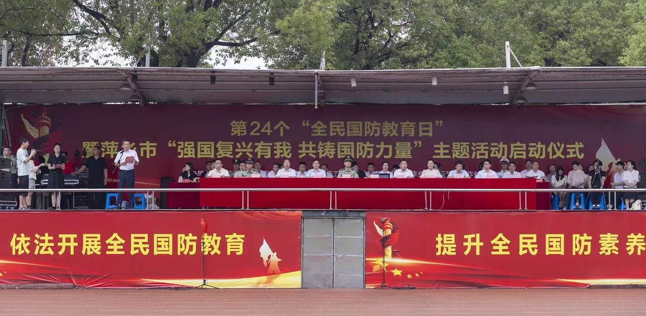 9月20日,第24个“全民国防教育日”暨萍乡市“强国复兴有我·共筑国防力量”主题活动启动仪式在我校第一田径场举行。市委常委、萍乡军分区司令员沈根火,校党委书记邱晓辉,校党委委员、副校长陈永国,校党委委员、副校长刘培圣,市委宣传部常务副部长刘恒,市委宣传部副部长田常红出席仪式。市全民国防教育工作领导小组成员单位分管领导、科室负责人以及各县区相关负责同志参加仪式。