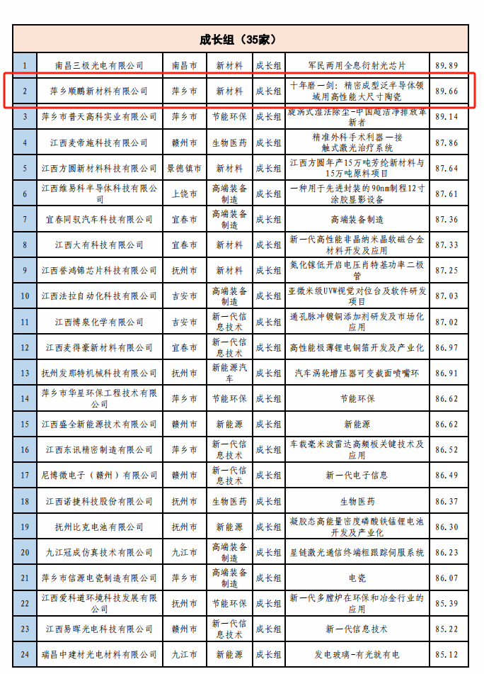 8月28日,由江西省科技厅、萍乡市人民政府主办,萍乡市科技局承办的第十三届中国创新创业大赛(江西赛区)决赛在萍乡进行。大赛采取线下路演答辩评审方式,共14位来自中国创新创业大赛专家库中的评委参加评审工作。来自新一代信息技术、生物医药、高端装备制造、新材料、新能源、新能源汽车、节能环保7个战略性新兴产业领域的21家初创组企业、35家成长组企业轮番登场,进行激烈角逐。最终,由我校材料与化学工程学院曾招余波博士及无机非金属材料22级学生刘昀萱等作为答辩人的萍乡市顺鹏新材料有限公司项目:“十年磨一剑:精密成形泛半导体领域用高性能大尺寸陶瓷”,以89.66分取得大赛成长组第二名的好成绩,荣获省二等奖。