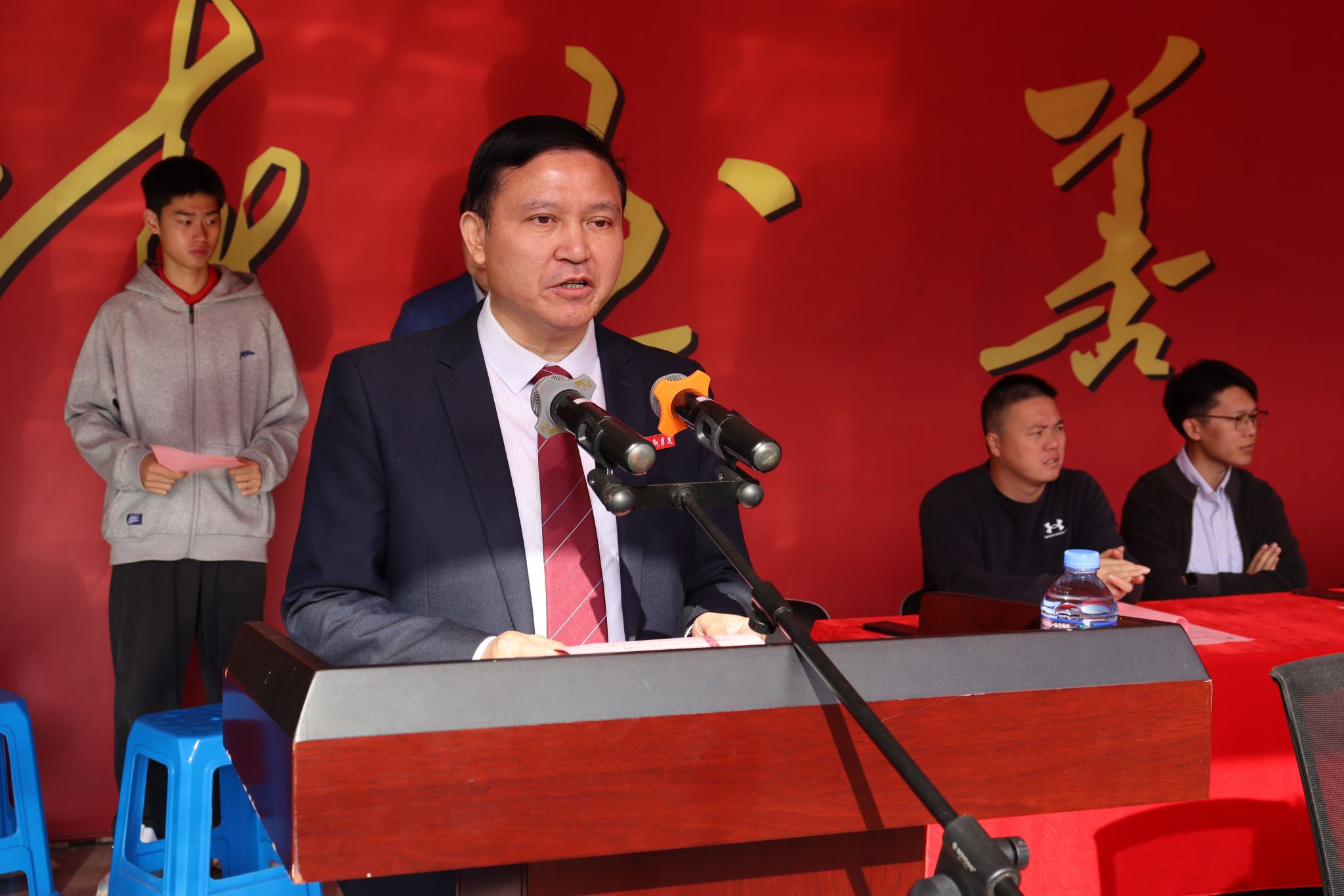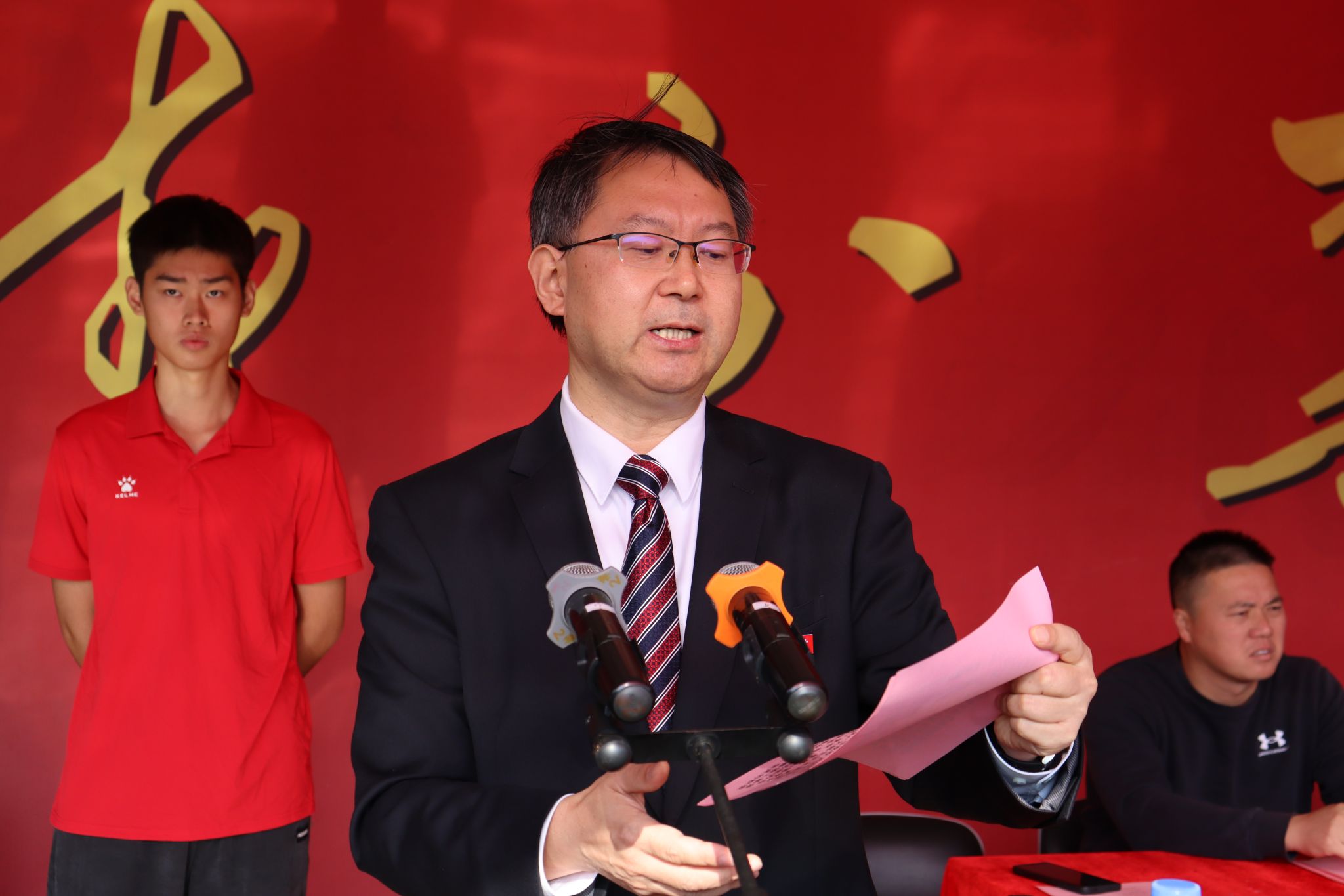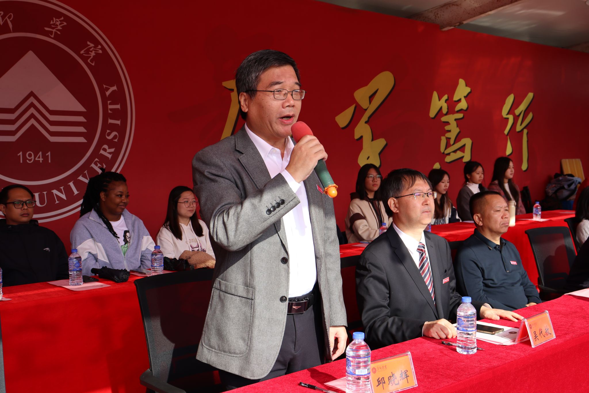 副校长吴代赦为开幕式致辞。他代表学校党委和行政,向筹备这次运动会的全体工作人员表示衷心的感谢,向参加开幕式的全体运动员、裁判员和师生员工致以亲切的问候和良好的祝愿。他表示,田径运动会和教职工趣味运动会,不仅是对我校体育工作的一次全面检阅,更是对我校师生精神风貌和综合素质的一次集中展示。他希望广大师生以本届运动会为契机,继续弘扬“更快、更高、更强、更团结”的奥林匹克精神,传承“为国争光、无私奉献、科学求实、遵纪守法、团结协作、顽强拼搏”的中华体育精神,在赛场上顽强拼搏、勇攀高峰,凝聚起团结、奋进的积极力量,以飒爽的英姿、饱满的热情、昂扬的斗志,共同绘就健康中国和体育强国的生动图景,凝聚起强国复兴的体育力量,为加快推进我校高质量发展作出新的贡献。