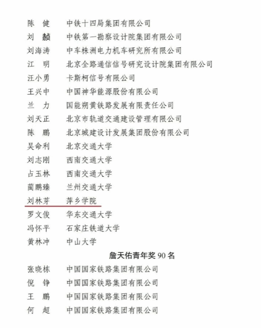 近日,第十七届詹天佑铁道科学技术奖评审结果公布,经专家评审组初评、詹天佑奖奖励评审委员会复审和詹天佑科学技术发展基金会第四届理事会终审,评选出获奖者134名,创新团队10个。其中,萍乡学院校长刘林芽荣获詹天佑成就奖。