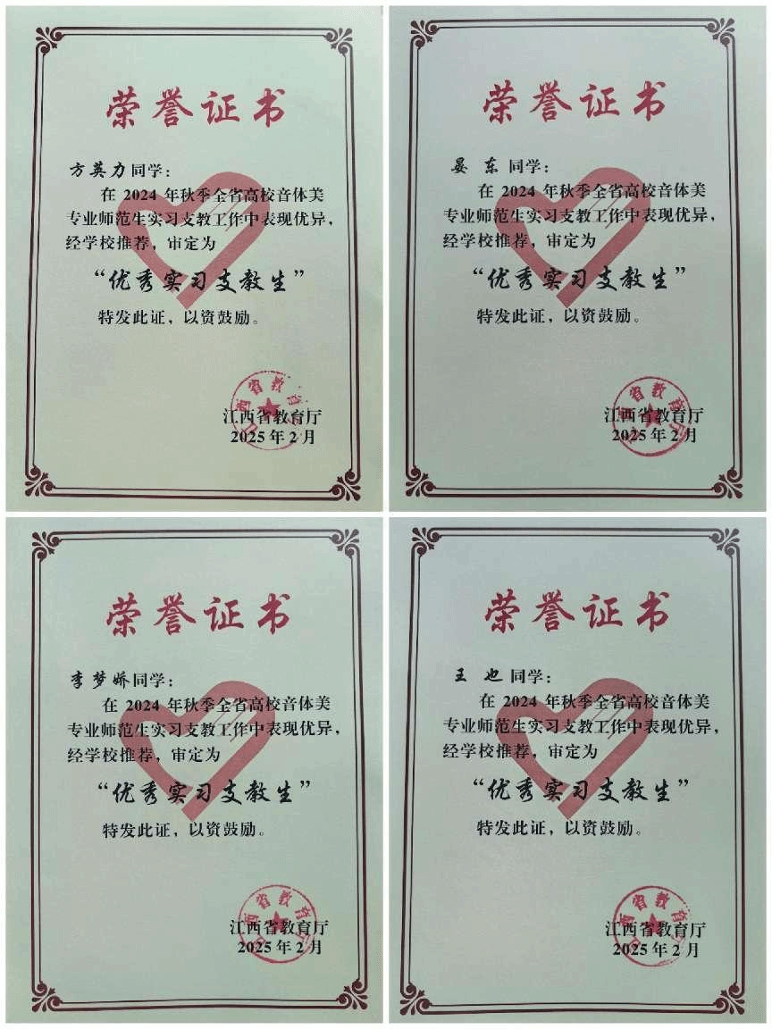 近日,我校艺术学院李梦娇、晏东,体育学院王也、方英力四位支教生,在2024年秋季全省高校音体美专业师范生实习支教活动中,凭借优异表现,喜获省级“优秀实习支教生”荣誉称号。此次支教活动是江西省委、省政府深入贯彻落实党的二十届三中全会精神,积极践行立德树人根本任务的重要举措,也是省教育厅重点推动的工作之一。