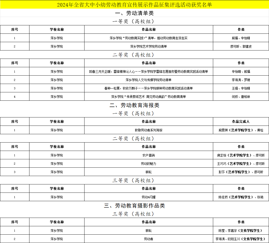 近日,省教育厅公布了2024年全省大中小幼劳动教育宣传展示作品征集评选活动获奖名单,我校在此次评选活动中取得优异成绩,获劳动清单类、劳动教育海报类、劳动教育摄影作品类等奖项13项,获奖师生26人次,其中学生7人,创我校该赛项新高,跻身全省本科高校前十,不仅全面展示了我校劳动教育深耕成效,更生动凸显了师生创新实践丰硕成果与精神风貌。