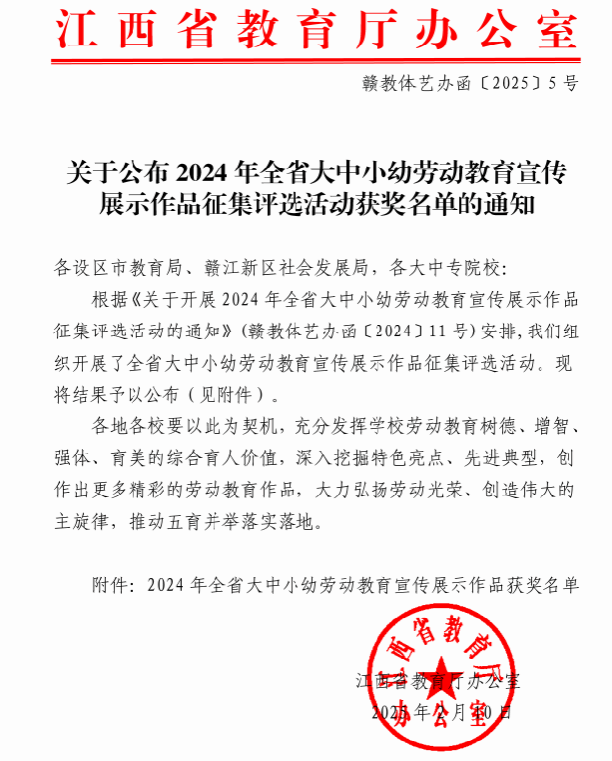 2021年,我校凭借在劳动教育领域的积极探索与实践,成功入选江西省劳动教育特色示范学校。2022年,我校获劳动教育典型案例奖三等奖1项,共有3名教师获奖。2023年,我校获劳动教育典型案例奖等4项,获奖人数增至6人,其中学生3人。截至目前,我校在劳动教育宣传展示活动中累计获奖项目达18项,35人次,学生获奖人数正逐年攀升。
